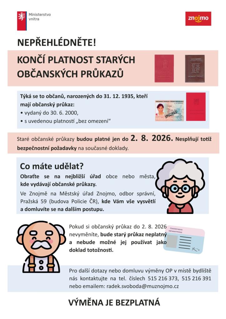 v souvislosti se změnou zákona o občanských průkazech dojde dne 2. srpna 2026 k ukončení platnosti všech starších typů občanských průkazů vydaných do 30. června 2000. Jedná se o občanské průkazy typu „knížka“ a o starší plastové průkazy (legitimace), které ještě neobsahují tzv. elektronicky (strojově) čitelnou zónu, jež je povinnou součástí nových typů OP. Vzory těchto dokladů naleznete v obou přílohách.